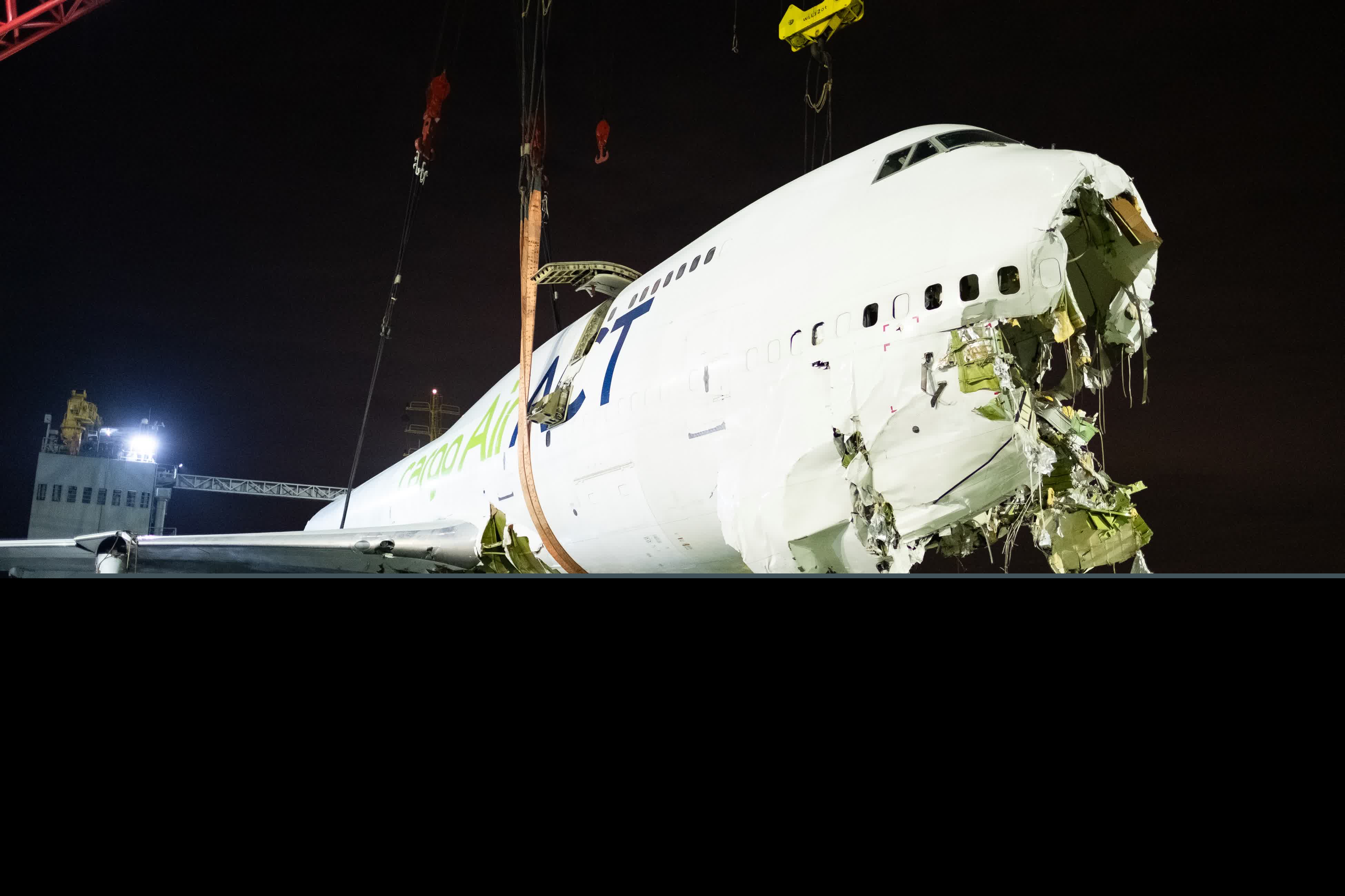 吊起的貨機主體可見損毀非常嚴重,左邊機翼的兩個引擎完全失去,機頭的起落架亦脫落致半個機頭失去。機管局圖片