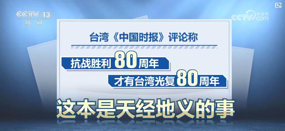 台湾《中国时报》评论称,抗战胜利80周年才有台湾光复80周年,这本是天经地义的事。台湾人就是要堂堂正正站出来,纪念光复80周年,不再做殖民地的奴隶,找回真正的历史。