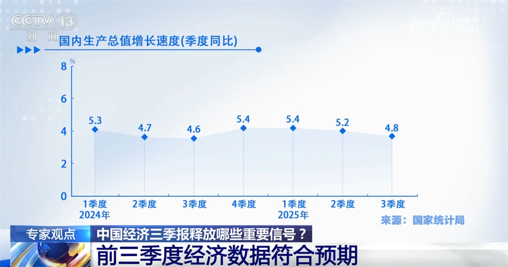央视网消息:中国经济“三季报”10月20日出炉:前三季度,国内生产总值(GDP)同比增长5.2%。分季度看,一季度同比增长5.4%;二季度增长5.2%;到了三季度,放缓至4.8%。如何看待前三季度经济增长的总量和趋势?这些重要数据的背后透出了哪些信号?来看宏观经济学家上海财经大学校长刘元春的观点。