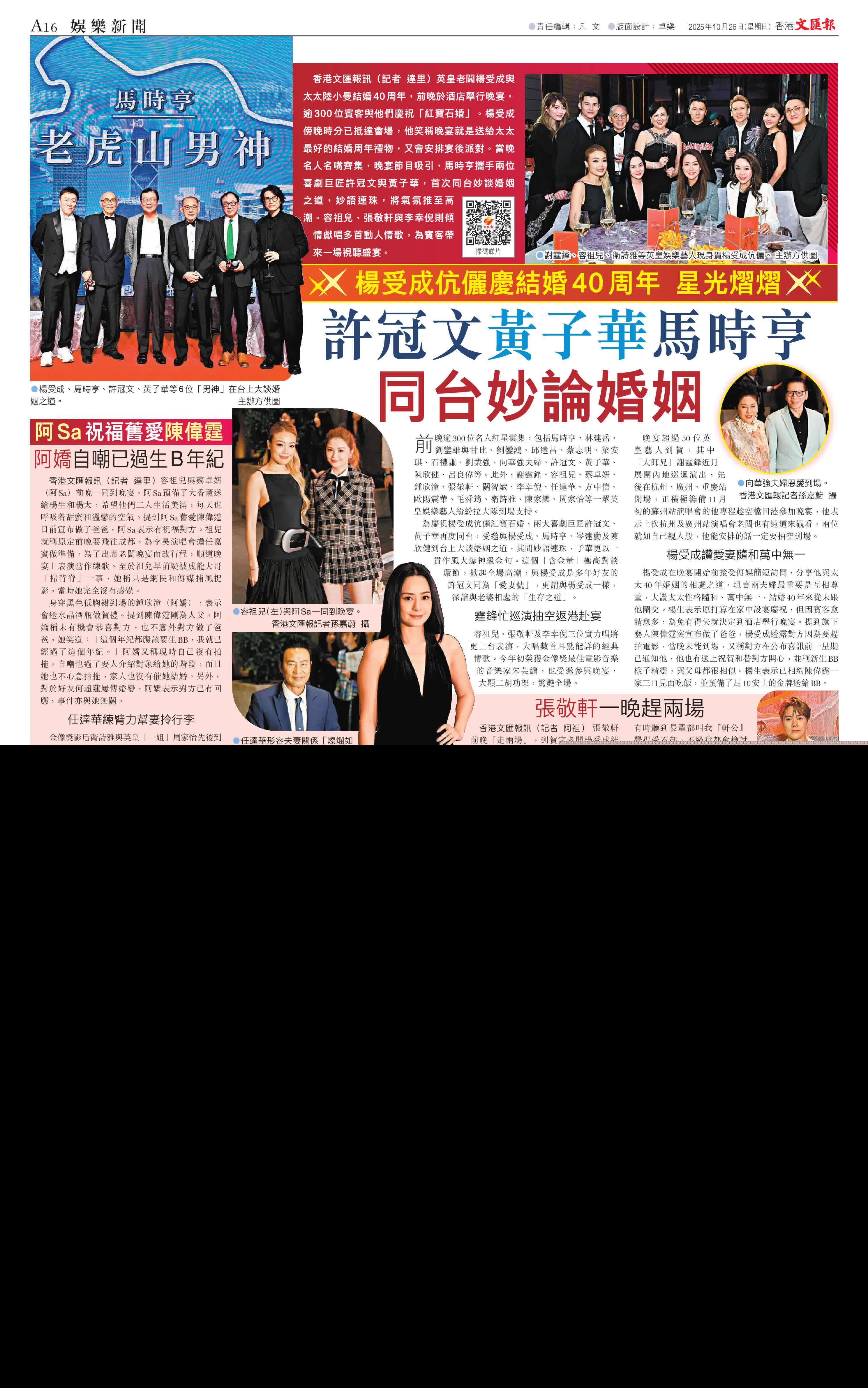 香港文匯報訊(記者 達里)英皇老闆楊受成與太太陸小曼結婚40周年,前晚於酒店舉行晚宴,逾300位賓客與他們慶祝「紅寶石婚」。楊受成傍晚時分已抵達會場,他笑稱晚宴就是送給太太最好的結婚周年禮物,又會安排宴後派對。當晚名人名嘴齊集,晚宴節目吸引,馬時亨攜手兩位喜劇巨匠許冠文與黃子華,首次同台妙談婚姻之道,妙語連珠,將氣氛推至高潮。容祖兒、張敬軒與李幸倪則傾情獻唱多首動人情歌,為賓客帶來一場視聽盛宴。