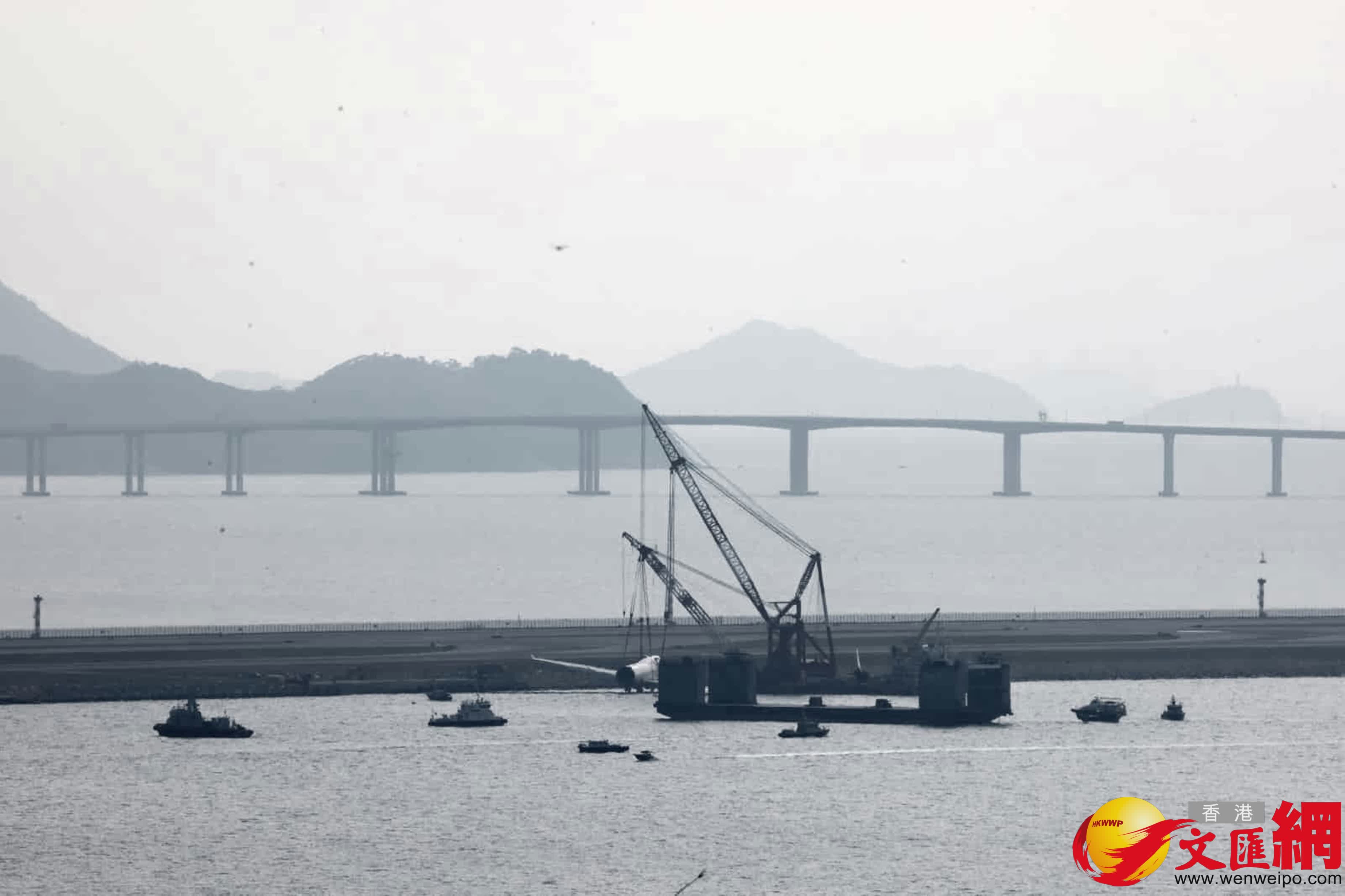 今日早上約9時,打撈團隊的打撈船「南天翔」、「南天鵬」及拖船「穗救拖18」,再吊起貨機的部分機身殘骸放在躉船上。隨後工程人員小心用鋼索從四邊固定擱在跑道對出防波堤海中的最大一件殘骸,即貨機的機身連機頭部分。至下午約1時半開始,打撈船的吊機逐步緩慢將整件殘骸吊起,可見左邊機翼逐漸離開水面。另一艘同屬廣州打撈局,用作承載超大物件的半潛船「重任1500」,則在拖船「德鵬」號協助下遂步移近北跑道現場。
