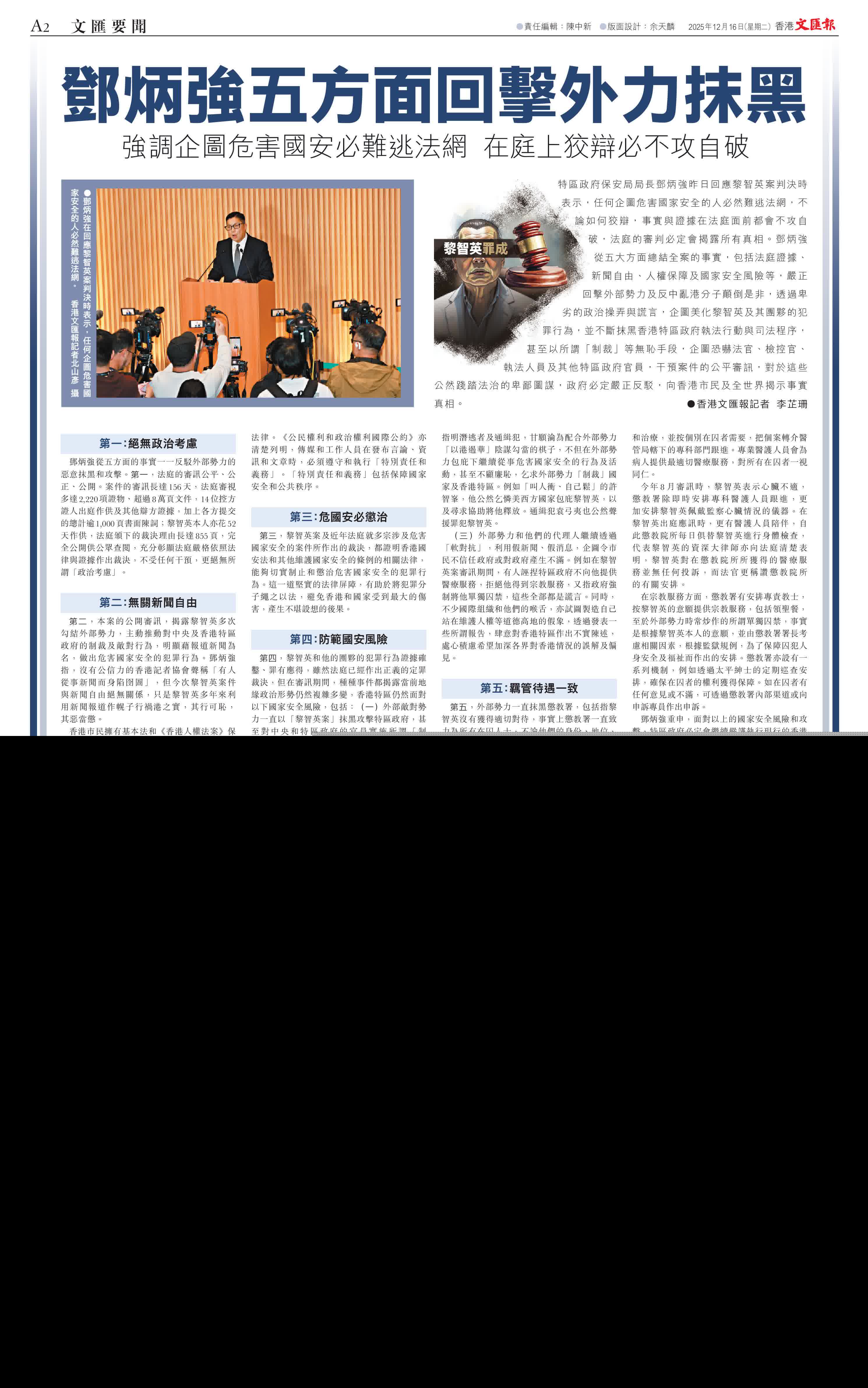 (香港文匯報記者 李芷珊)特區政府保安局局長鄧炳強昨日回應黎智英案判決時表示,任何企圖危害國家安全的人必然難逃法網,不論如何狡辯,事實與證據在法庭面前都會不攻自破,法庭的審判必定會揭露所有真相。鄧炳強從五大方面總結全案的事實,包括法庭證據、新聞自由、人權保障及國家安全風險等,嚴正回擊外部勢力及反中亂港分子顛倒是非,透過卑劣的政治操弄與謊言,企圖美化黎智英及其團夥的犯罪行為,並不斷抹黑香港特區政府執法行動與司法程序,甚至以所謂「制裁」等無恥手段,企圖恐嚇法官、檢控官、執法人員及其他特區政府官員,干預案件的公平審訊,對於這些公然踐踏法治的卑鄙圖謀,政府必定嚴正反駁,向香港市民及全世界揭示事實真相。