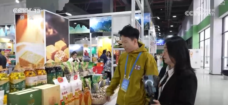 在河南展区,陶红玲正对着手机镜头介绍家乡的茶油。