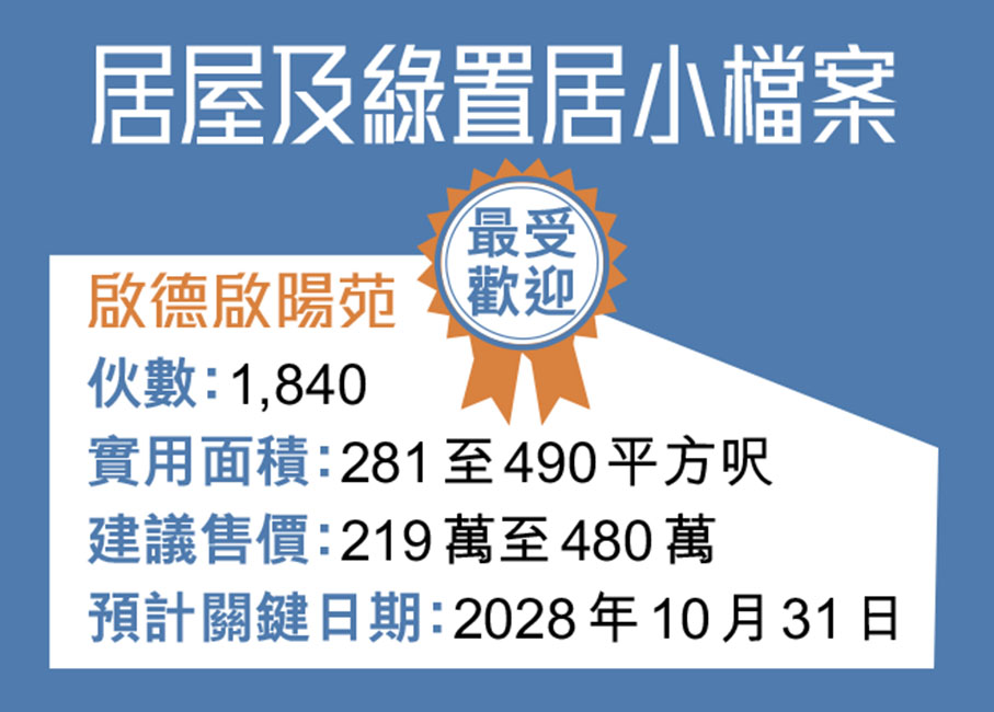 新推出的啟德啟陽苑,是唯一在九龍市區的新居屋項目,屋苑鄰近港鐵宋皇臺站,提供1,840個單位,當中八成屬小型至中型單位,而東涌的裕豐苑則有最多單位,共有2,018伙。房委會最快明年第二季接受申請。