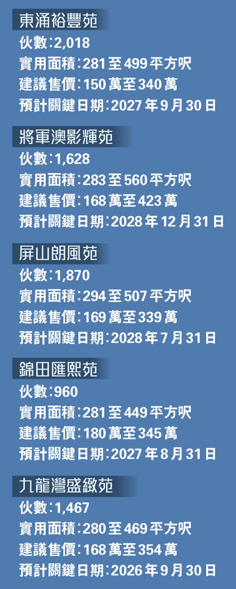 房委會新一期推出的5個居屋項目,分別是錦田匯熙苑、東涌裕豐苑、屏山朗風苑、啟德啟陽苑及將軍澳影輝苑,共提供超過8,300伙單位,面積介乎281至560平方呎,平均呎價6,240元至9,300元,售價介乎150萬元至480萬元。當中東涌裕豐苑賣150萬起屬最平,若以綠表最多九成半按揭計算,即首期只要7.5萬元起。至於位於九龍灣宏照道的綠置居盛緻苑,則提供1,467個單位,以市價六折發售,介乎168萬元至354萬元。